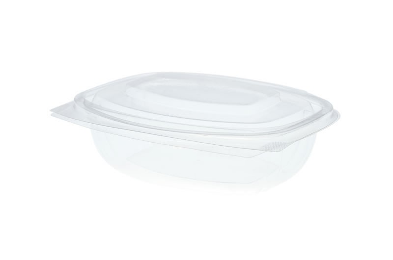 Clear rectangular deli container with a hinged lid for easy serving. Great seal, perfect for cold salads, desserts and deli treats. Made from plants, not plastic.