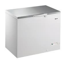 Chest Freezer equipped with lift up stainless lid, handle and lock, defrost water drain complete with 2 wire baskets. Temperature Range: -22 / -14°C. Volume Gross: 347 ltr. Exterior / Interior: White / hammered aluminium.