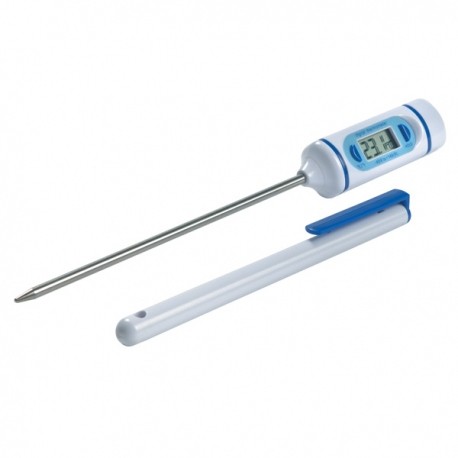 Compact, pen-shaped digital catering thermometer with stainless steel probe.